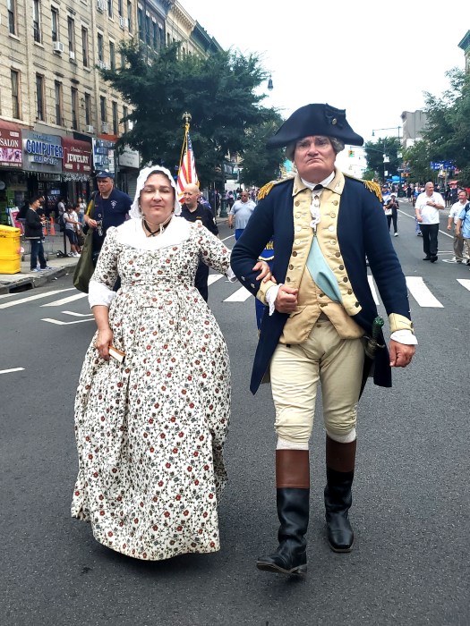 Marchers included the Knights of Columbus, the Boy Scouts of America, and George and Martha Washington. Historical reenactors of the famous first couple made their way down Fifth Avenue arm in arm.