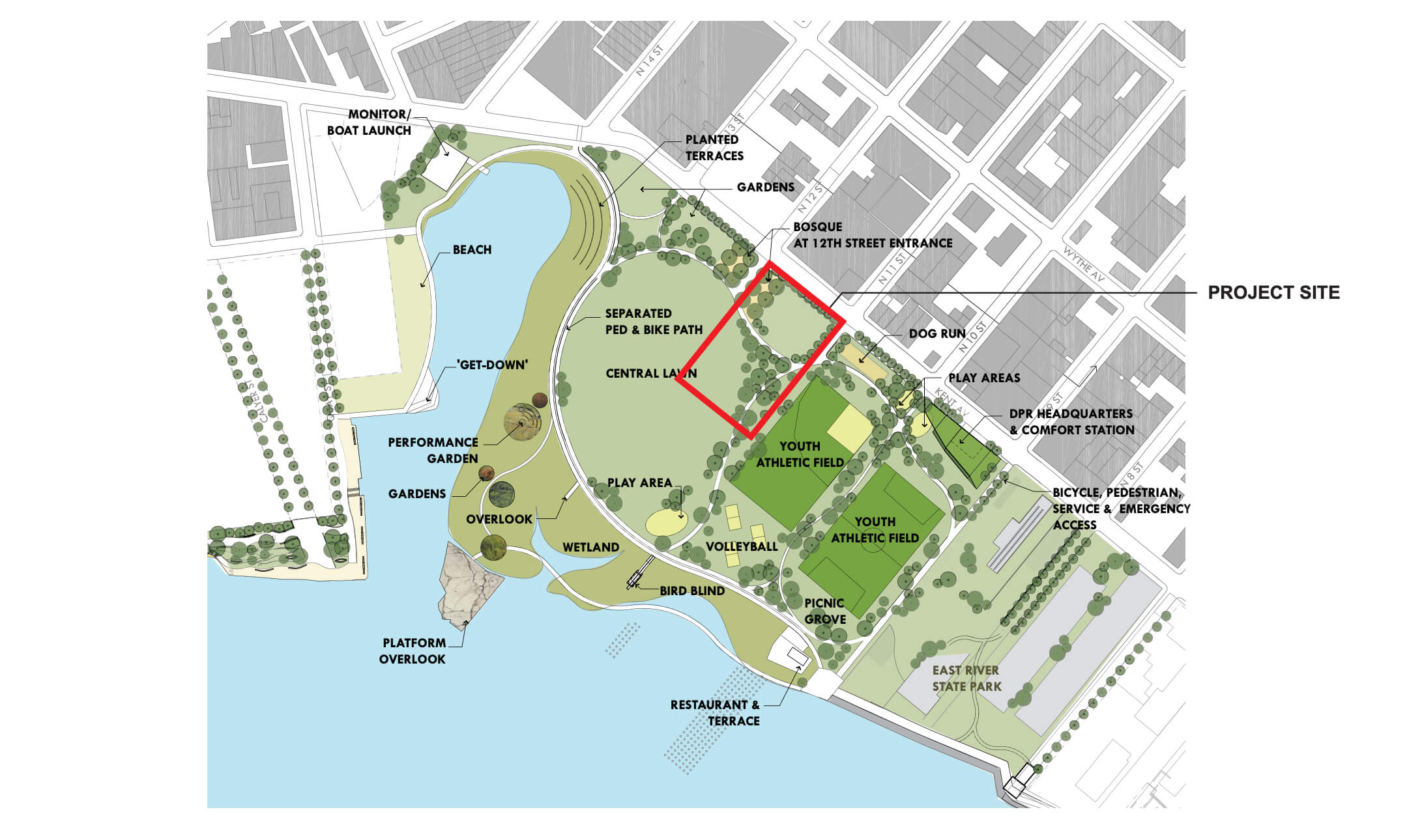 The plan calls for a continuous open waterfront stretching from N. Third Street to the northern tip of Manhattan Avenue at the Newtown Creek and includes new parks and waterfront esplanades built by high-rise developers along the shore.