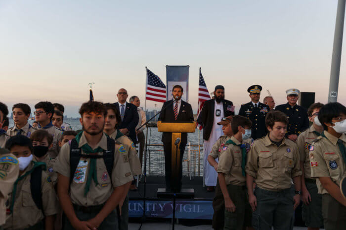 New York City Councilmember Justin Brannan, state Senator Andrew Gounardes, Assemblymember Peter J. Abbate Jr., and NIA Community Services network hold a vigil to remember and pay tribute to those who died in the attacks and in their aftermath.