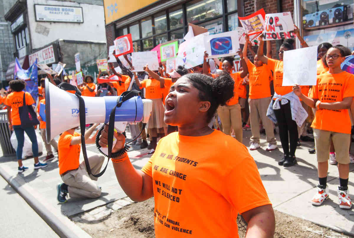 Many youngsters waved signs and wore bright orange shirts — similar to those donned by demonstrators who marched across the Brooklyn Bridge for common-sense gun-law reform earlier this month — during the protest, which educators okayed ahead of time so that nobody would be marked absent like some kids who walked out of borough schools earlier this year in a nationwide call for legislative change.