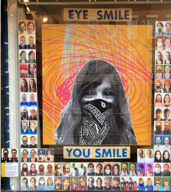 Art on display includes “Eye Smile, You Smile,” a photo wall installation of paired pictures showing people smiling with and without masks, by Miguel Ayuso.