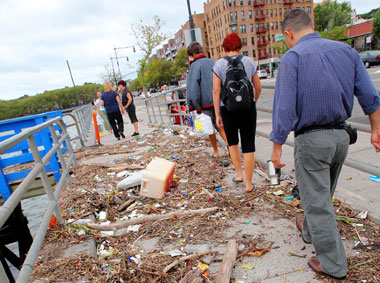 Residents avoid flotsam that came ashore on Emmons Avenue during Hurricane Irene.