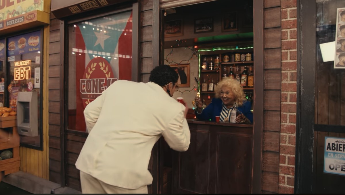 The set was a precise replica of Toñitas, the beloved Puerto Rican social club in Williamsburg. Above Bad Bunny’s head, the bar’s address, 244 Grand St., was visible in reflective letters, just as it looks at the real bar.