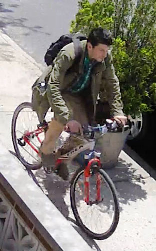 The pedal pincher reportedly broke into a garage near 64th Street and 10th Avenue at 11:20 am on May 7 and took a Trek bicycle, reports state. The man made his getaway on the hot wheels, and was brazen enough to ride on the sidewalk, security footage circulated by police shows.