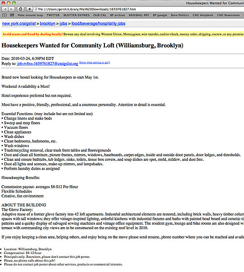 Friday’s eviction comes at a crucial moment in the underground hostel scene. Earlier in the week, someone got wind of another clandestine hotel, this one in the old Glove Factory on Graham Avenue in Williamsburg. A Craigslist posting seeking “housekeepers” was quickly removed from the online classified Web site, apparently after someone figured out that the hostel might, in fact, be illegal.