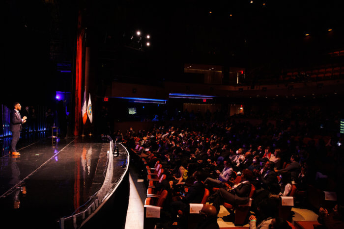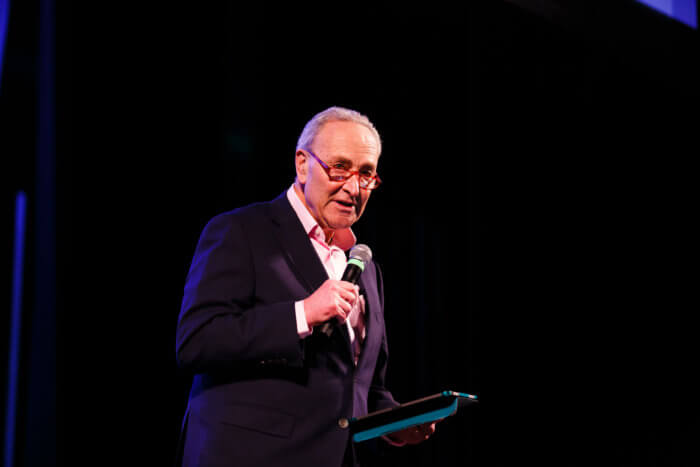 The City Tech auditorium was filled with a cheering crowd of people from all over Brooklyn, including Reynoso’s fellow borough presidents and his predecessor, Mayor Eric Adams. The beep invited some colleagues in government to speak ahead of his address, including fellow “Brooklyn boy” U.S. Senator Chuck Schumer.