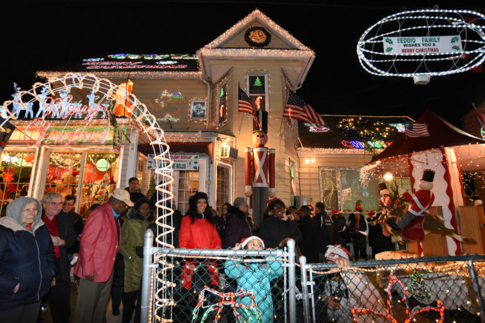 The Seddio family light display’s opening night was attended by Santa Claus, elves and a dozen other costumed characters, and featured carols sung by Public School 115’s chorus and the Holy Family Church choir accompanied by a steel drum band.