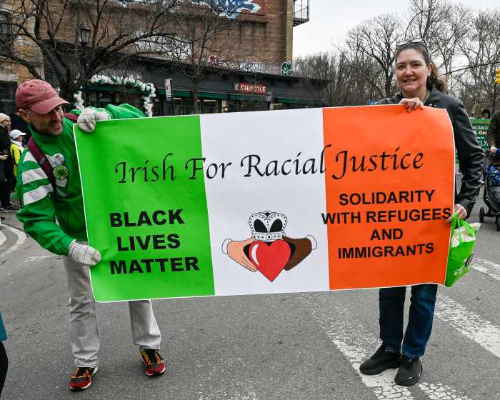 At the parade’s pre-breakfast at Nitehawk Cinema on Prospect Park West, local lawmakers, including Assembly members Robert Carroll and Jo Ann Simon, State Sen. Andrew Gounardes, Deputy Borough President Kim Council, Brooklyn District Attorney Eric Gonzalez, and Council Member Shahana Hanif, joined members of the Friendly Sons of St. Patrick of Brooklyn and the Brooklyn Irish LGBTQ Organization to celebrate the historical significance of St. Patrick, the patron saint of Ireland, and the immigrant experience, not only for the Irish but for all immigrants.