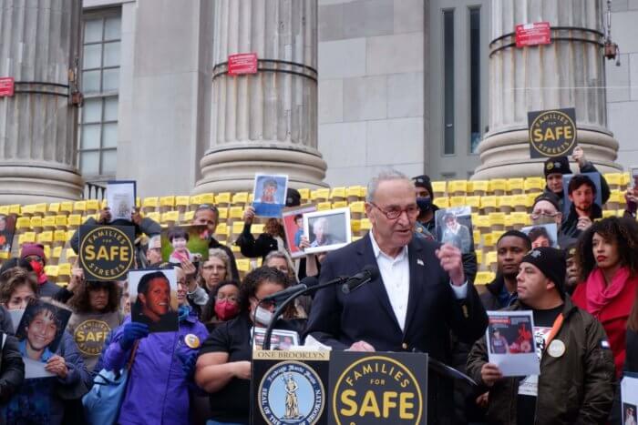 Senate Majority Leader Chuck Schumer briefly joined to pledge his support, saying funds from the recently-enacted $1.2 billion Bipartisan Infrastructure Framework could be used to address street safety.