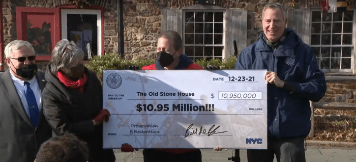 Mayor Bill de Blasio on Thursday presented Park Slope’s historic Old Stone House with a giant check for nearly $11 million, intent on preserving and restoring the centuries-old landmark rife with historical significance.