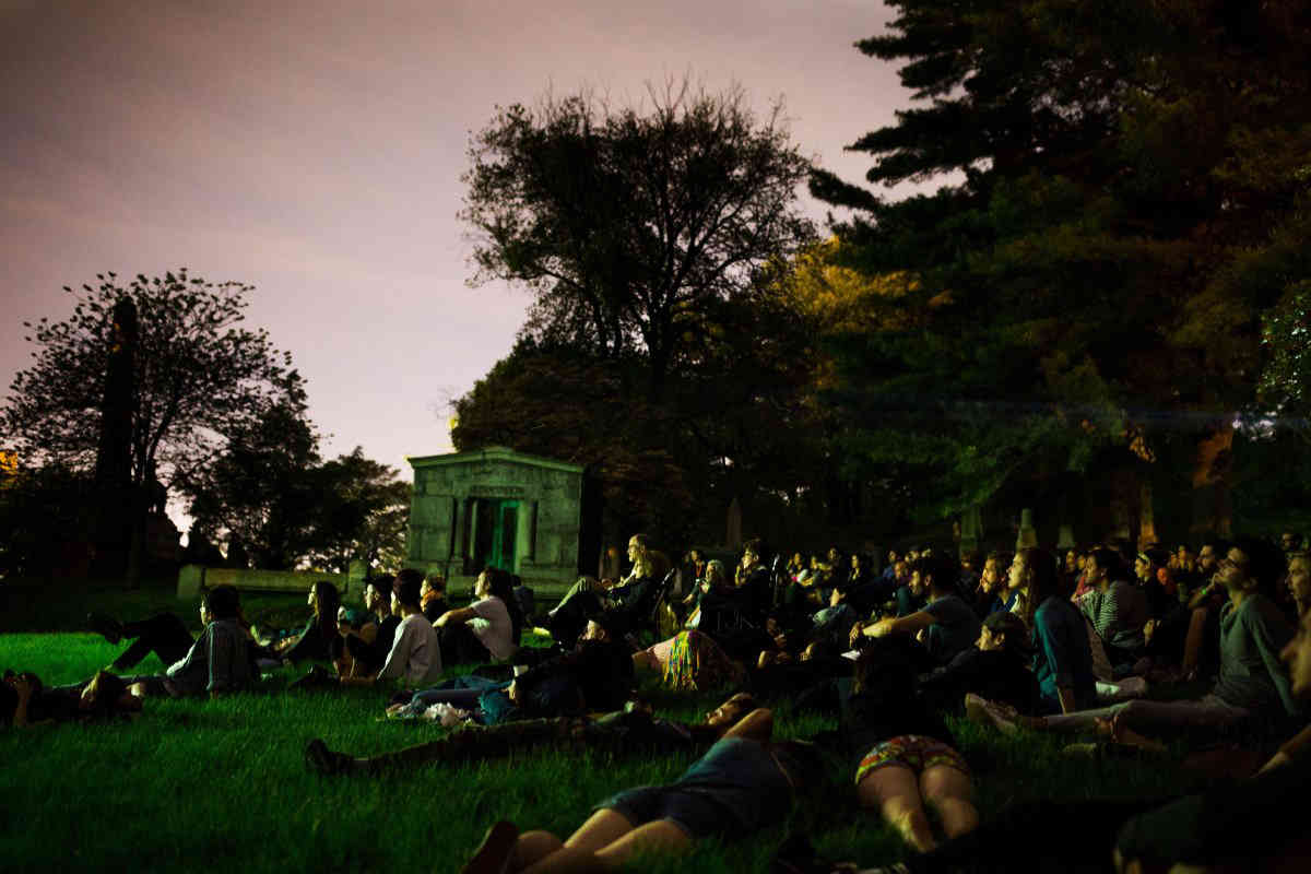 The Rooftop Film series kicked off its summer season in Green-Wood Cemetery on May 17, and has a brace of non-fiction films lined up for the rest of the summer. The movies are projected onto a giant, inflatable screen set up in the road just a short walk from the front gates. Most viewers settle into folding chairs, though a few spread blankets among the graves on either side of the road.