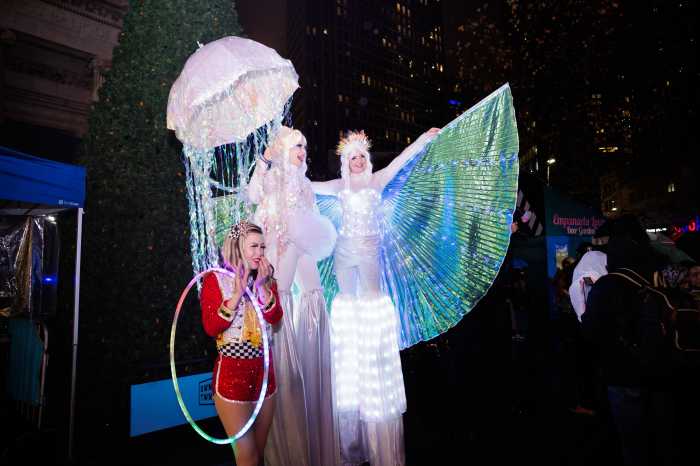 Before the lights came on, spectators watched a lively display of light performers who danced, juggled, rollerskated, and twirled hula hoops, painting the square with bursts of color. DJ Mike Doelo set the stage for carols by Janis Weatherly and members of the Lafayette Avenue Presbyterian Inspirational Choir.