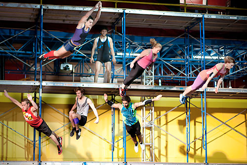 It helps, of course, to have super cool stunt equipment, and Streb got her hands on some nifty tools to make her unique vision possible in the show, which opens this Friday at her Williamsburg space. That includes air rams, which can eject people as far as 70 feet sideways at incredible speeds, as well as a jerk vest, a harness that can rapidly move its wearer in different directions at breakneck speed.