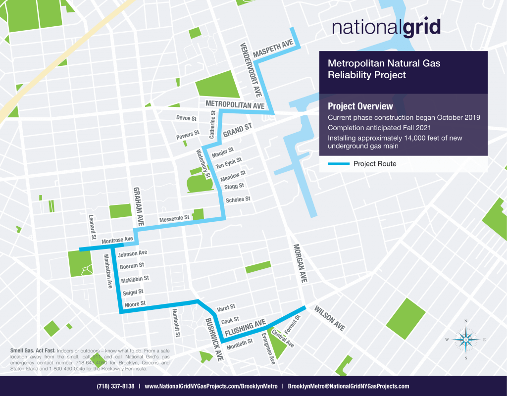 The company started work on the project in 2017 in Brownsville, before continuing to tear up streets and lay down the pipe through Bedford-Stuyvesant, then heading west through Bushwick and East Williamsburg, with plans to end at Nat Grid’s Maspeth Avenue depot at Newtown Creek in 2021.