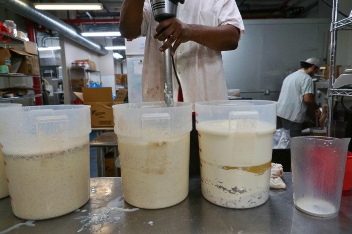 Each of those stores receive shipments of up to 160 three-gallon tubs of ice cream in Ample Hills’ signature flavors per week. And all of that ice cream – up to 1,500 pounds of it — is churned in the company’s modest manufacturing facility in Industry City.