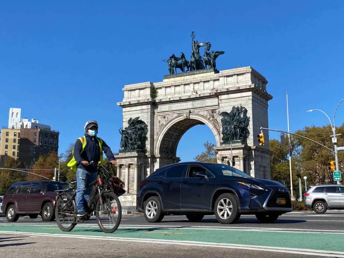 Department of Transportation officials first lauded a new Flatbush Avenue protected bike lane at Grand Army Plaza, which spans from the local monument to Ocean Avenue, before inviting Brooklynites to ride along Prospect Park West to Second Street and up Fourth Avenue to Bergen Street, where they then marked the completion of a new protected lane from 65th Street to the Barclays Center.