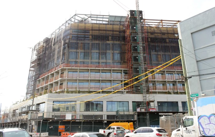 Plenty of workers were busy at 25 Stewart Avenue when Brooklyn Paper’s sister site Brownstoner visited in late February. Not much more than a three-story partial skeleton in 2022, the 149-foot-tall concrete structure topped out late last year. All but the top stories are now visible, a row of greenery peeks over a broad terrace ringing the building, and all the windows appear to be in.
