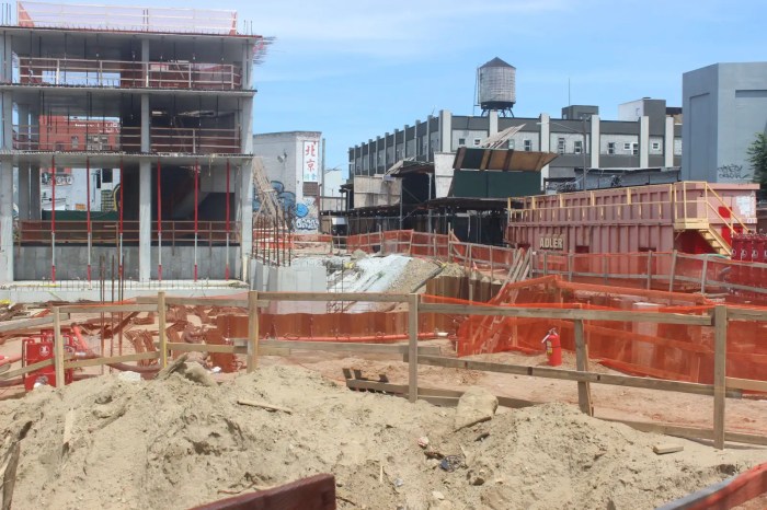 While black netting covers most of the upper floors, the two-story podium and lower levels are exposed, showing a grey concrete facade with big glassy windows and plants atop the podium. While renderings attached to the construction fence depict the podium as light green, along with the balconies on rooms from the third to fifth floors, the latest renderings indicate the facade will be finished in light grey concrete, with darker grey for a setback at the eighth floor.