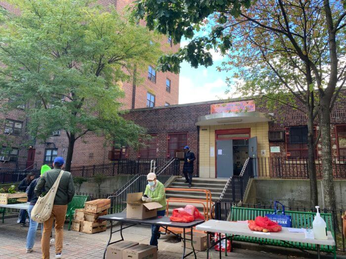 On Saturday morning, Oct. 8, members of Gowanus Mutual Aid and tenant leaders at Gowanus Houses were handing out free bushels of carrots, potatoes, and Swiss chard to tenants of the public housing development.