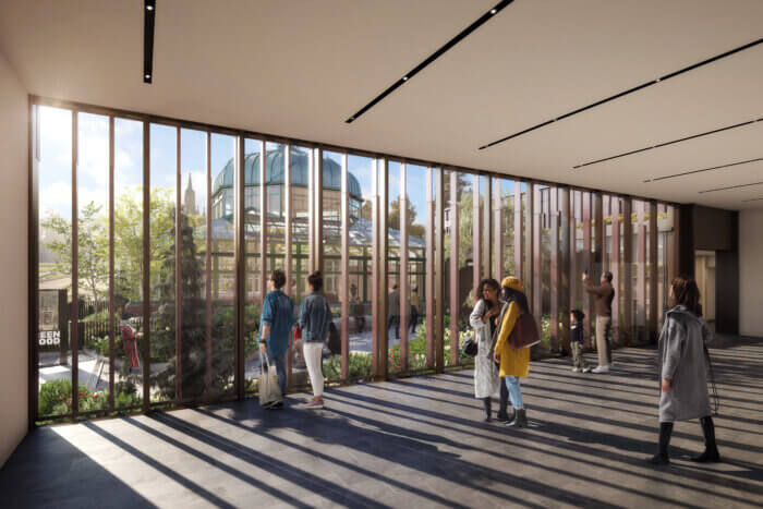 The finished design will see a two-story L-shaped curtain wall of custom glazed terra cotta wrapped around Green-Wood’s nineteenth-century Weir Greenhouse. Inside, it will feature multi-use event spaces, a center for scholarly research, and two exhibition galleries for Green-Wood’s vast archives, which date back to its 1838 incorporation.