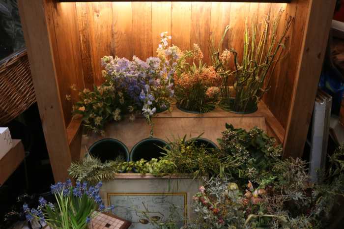 The small shop is located in what was once an 1800s carriage house. Antique art of bouquets and kittens adorns sage limewashed walls, while vintage upholstered chairs transport customers to the streets of Florence. At the back of the storefront, a glass floral cooler displays eight galvanized French buckets of fresh flowers for sale.