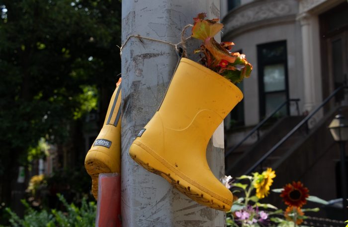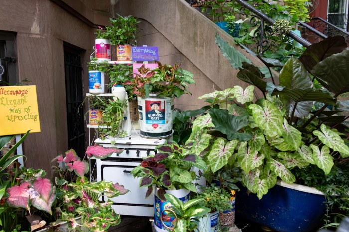 All along the block, blooming marigolds, petunias, hydrangeas, sunflowers, sedum, and begonias are interspersed with elephant ears, coleus, heuchera, hostas, caladium, and ferns. A visitor will also spot many upcycled items, including a vintage stove, food cans, and a pair of blue faux snakeskin boots. In one tree pit, 6-year-old Kassidy had created a small fairy garden complete with two resting fairies.