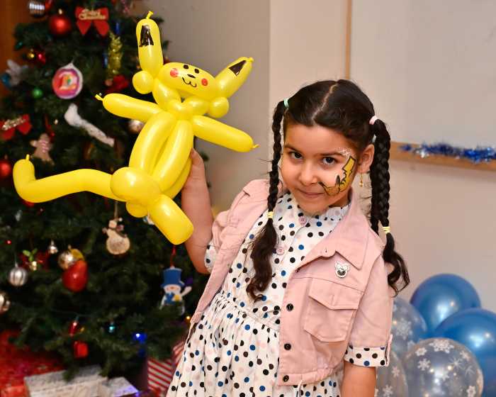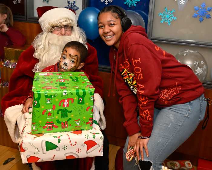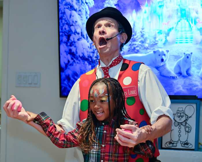 Dozens of patients with hematology-oncology conditions, chronic blood disorders and chronic infusion needs gathered in the cancer center’s conference room, eagerly awaiting Santa’s arrival. Balloon and face-painting artist Lavinia Solan and “Looney Louie the Clown” entertained patients alongside their parents and siblings before St. Nick made his grand entrance to cheers and hugs.