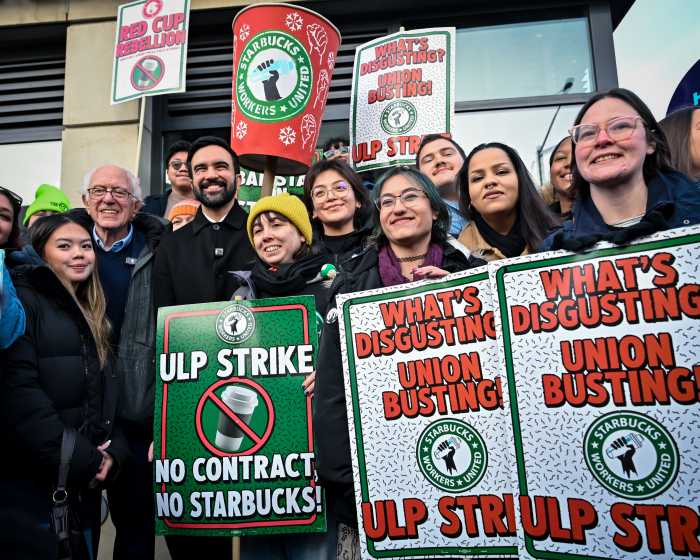 New York City Mayor-elect Zohran Mamdani and U.S. Sen. Bernie Sanders of Vermont joined dozens of striking Starbucks union baristas at a picket line in Gowanus on Dec. 1, calling on the company to return to the bargaining table and offer a fair contract.