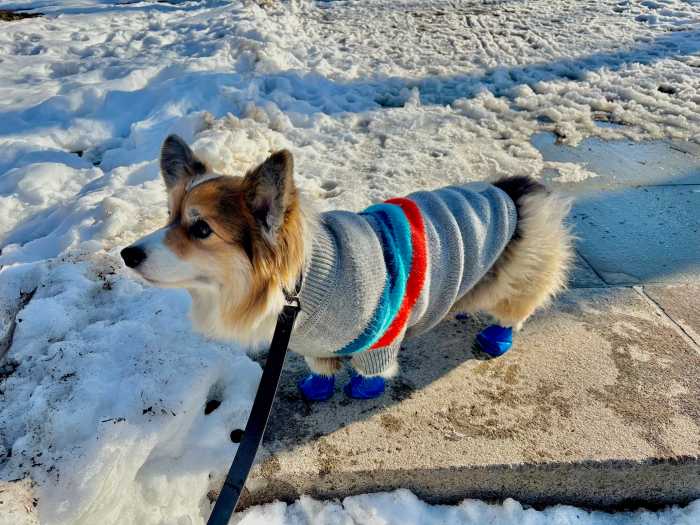 A Golden State-turned-New Yorker corgi struts through New York City streets in style, sporting blue rainboots and a gray sweater that protect his rare, fluffy tricolor coat.