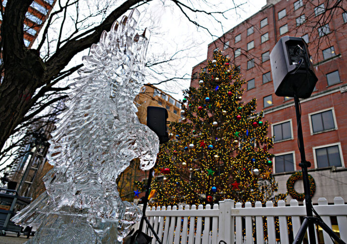 The courtyard is lined with elaborate ice sculptures, with a gigantic Christmas tree adorned with an assortment of lights and baubles serving as the centerpiece of the festive display. The chilled statues are shaped into a collection of animals both mythical and natural, including snails, reindeer, hawks, and even a Sasquatch.