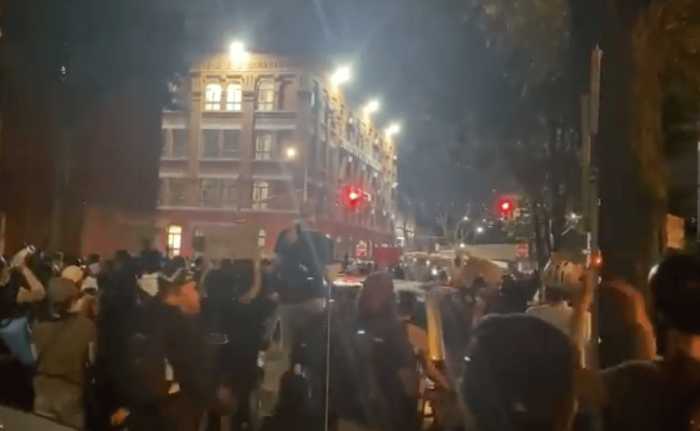 Video from the scene shows a group of cops standing in the intersection, with some wearing riot helmets and holding batons — and several others not wearing face masks.