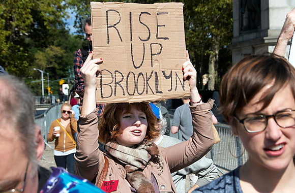 More than 100 people — including the borough’s top elected official in a quietly supportive role — ushered Brooklyn into the Occupy Wall Street movement with a three-hour rally for economic justice on Saturday in Grand Army Plaza.
