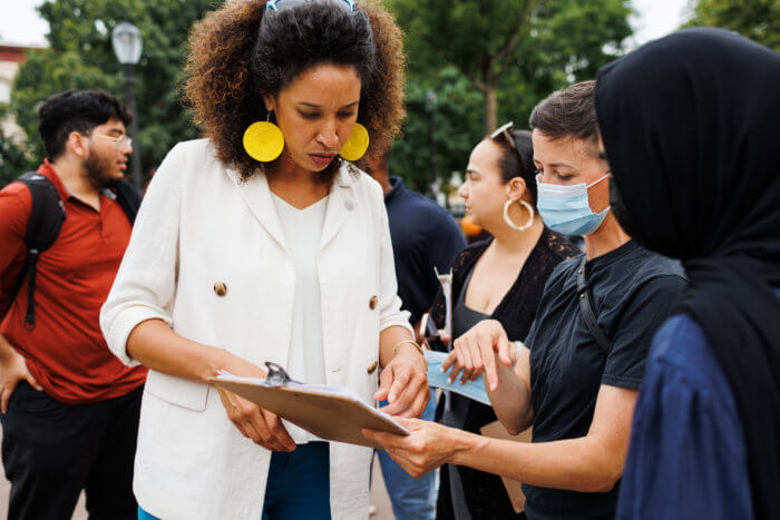 Fourteen people, including Nurse and members of the Tenants Coalition, gathered in Irving Square Park in Bushwick ahead of a canvass Wednesday night.