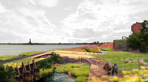 This “riparian buffer zone” off the Red Hook waterfront would even allow Brooklynites to walk over the one mile gap between Brooklyn and Governor’s Island.