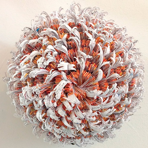 “The work is obsessive, meditative, repetitive,” said Jaynie Crimmins, an extraversion-intuition-feeling-perceiving type who used shredded household mail to make an eye-catching sphere that looks like a flower. “The piece, ‘External Factor 1,’ is the beginning of a new direction for my work, moving from the organic forms I have used in my work to finding the beauty and geometry in nature.”