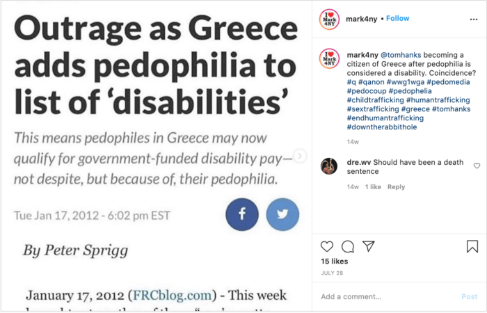 “@tomhanks becoming a citizen of Greece after pedophilia is considered a disability. Coincidence?” Szuszkiewicz wrote, followed by the hashtags for QAnon, Q, and the group’s slogan.