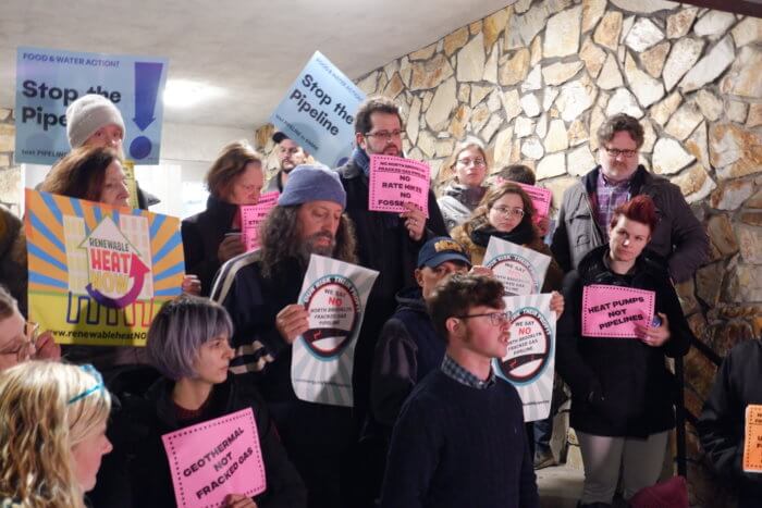 Protestors gathered in opposition to the gas main extension ahead of Community Board 1’s general meeting at Ainslie Street on Jan. 14.Photo by Kevin Duggan