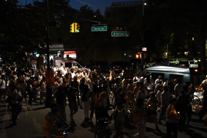 The police detail, which had been trailing the demonstration, formed a line around the perimeter of the Williamsburg park before advancing into the greenspace at around 1 am — the park’s official closing time — and aggressively attempted to clear the area, shoving protesters and eventually facing off against a line of marchers with bikes.