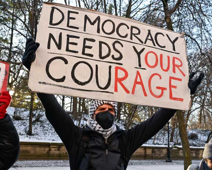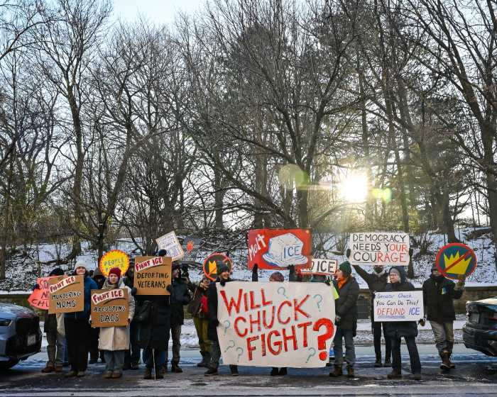 About 25 members of Indivisible Brooklyn, an all-volunteer grassroots group that organizes actions and events to promote justice and hold elected officials accountable, braved freezing temperatures on Jan. 20 to rally outside Sen. Chuck Schumer’s home in Park Slope.