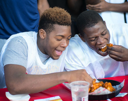 He and his fellow linemen from the five boroughs won by eating 7.98 pounds of wings, compared to 6.67 for Long Island. Watkins and his partner Jose Duncan of Erasmus Hall were one of the only groups to finish their entire tray of wings. His strategy was simple.