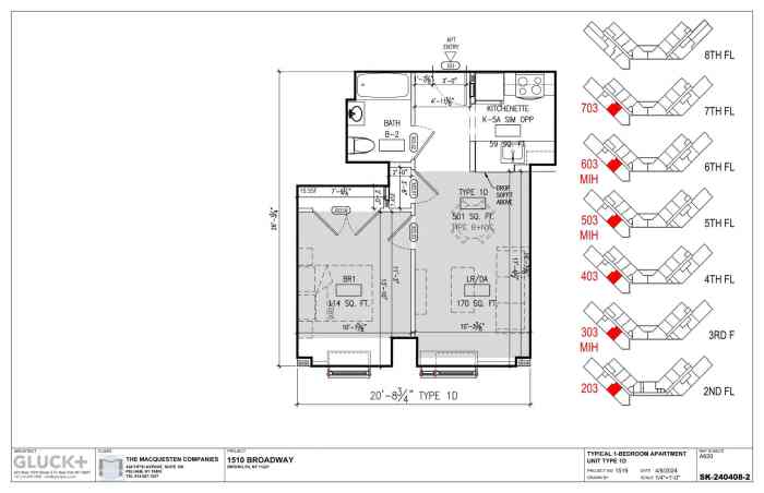 According to Gluck+’s website, the new development “responds to the critical need for affordable housing in the Bushwick and Bed Stuy neighborhoods in Brooklyn.” The firm says that rather than building eight stories right in front of the subway tracks, a creative V-shape design positions apartments along Hancock Avenue and Saratoga Avenue.