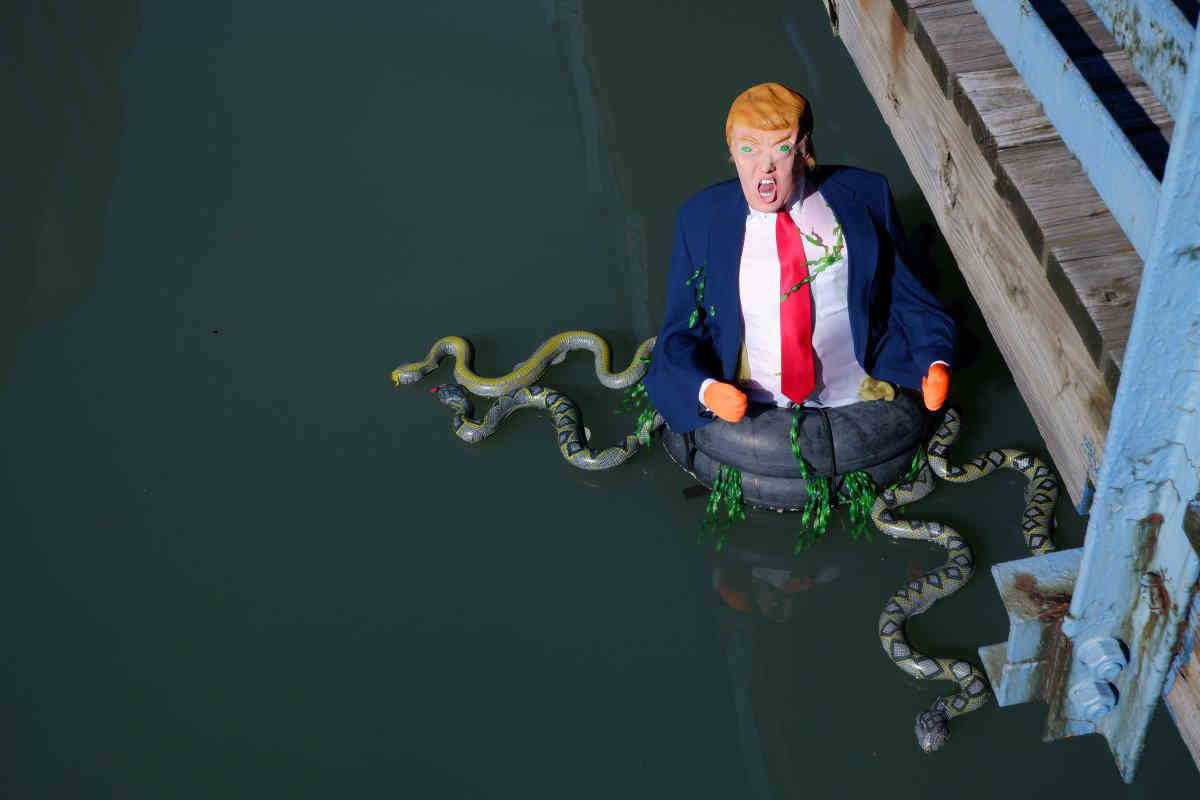 A green-eyed float of President Donald Trump surrounded by reptiles buoyed in the fetid Gowanus Canal over the weekend, leaving locals baffled and amused at the cartoon-like commander-in-chief, which trolled beneath the Carroll Street Bridge.