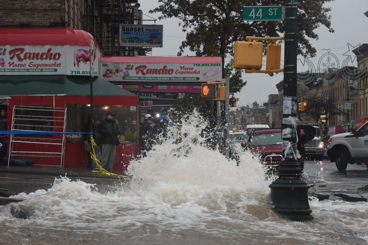 The water main erupted shortly after 5:30 am on Nov. 24 at the northwest corner of Fifth Avenue and 44th Street in Sunset Park, shooting rocks, sidewalk concrete and asphalt into the air and sending trash cans rolling down the street. At times, the water was shooting up to five feet high.