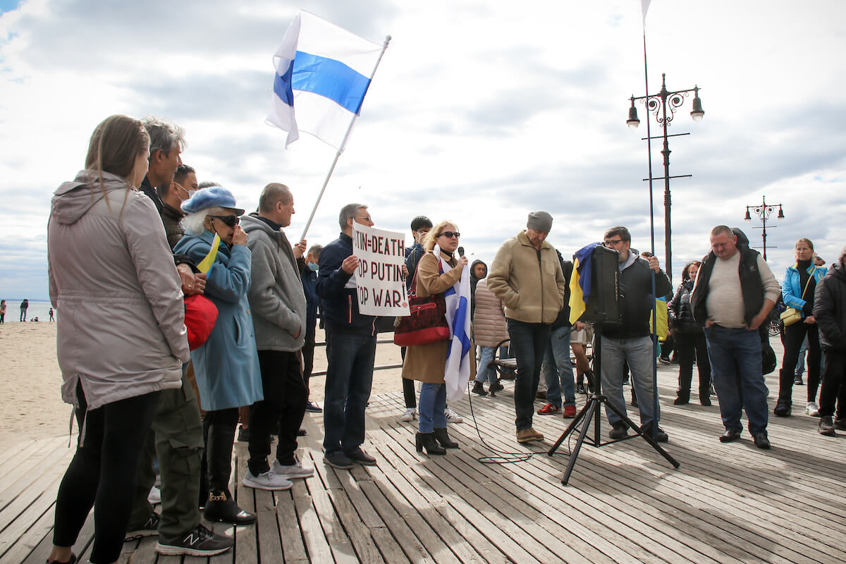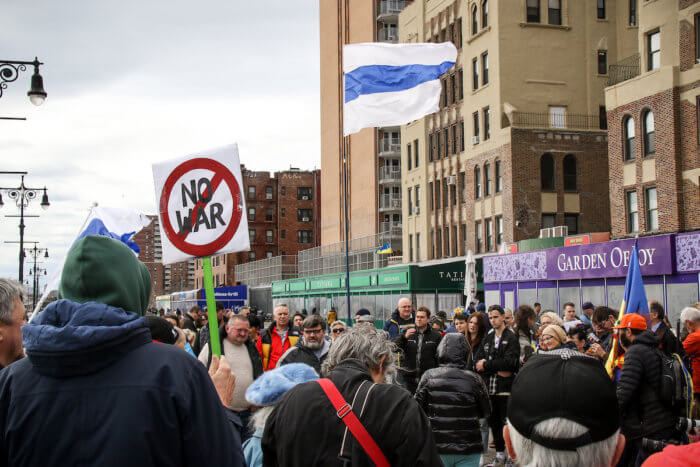 Hundreds of people from Russia, Ukraine, Georgia and Kazakhstan took to the Riegelmann Boardwalk in Brighton Beach on Sunday to stand with residents of Ukraine — just one day after a similar showing of support in one of the Russian diaspora’s largest communities outside of eastern Europe.