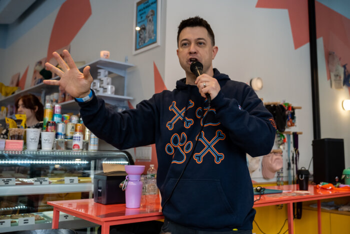 According to Boris and Horton’s co-owner, Logan Mikhly, the Driggs Avenue shop (which also has a location in the East Village), has hosted a Puppy Bowl viewing party for a few years. This year’s watch party doubled as an adoption event after Best Friends reached out to help animals find their forever homes.